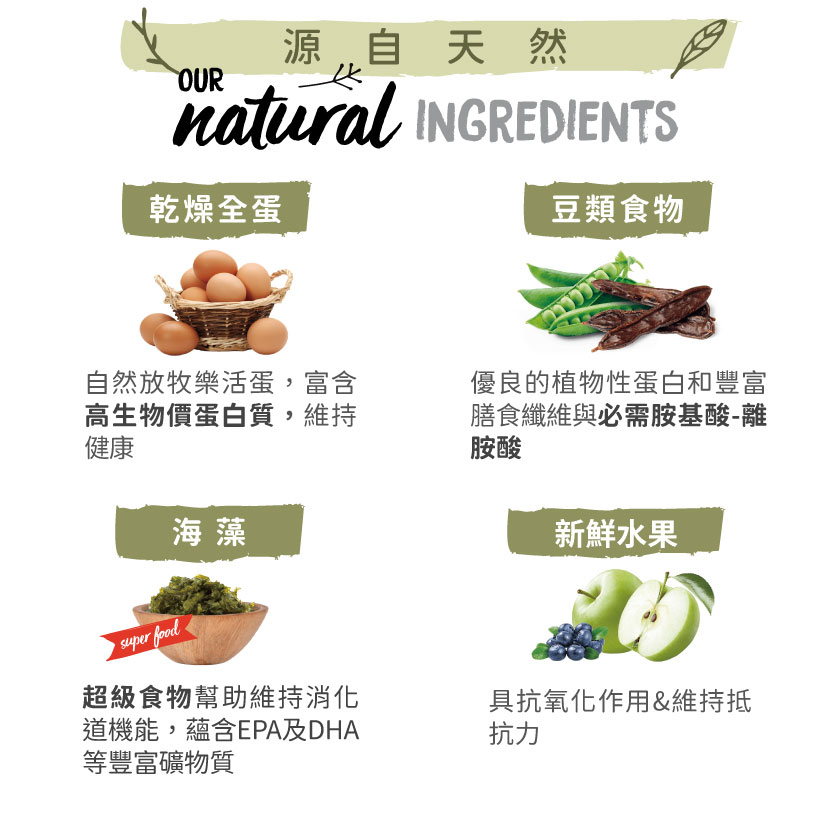 新鮮雞肉*(最少25%)、新鮮火雞*(最少25%)、脫水雞肉(12%)、脫水豬肉(9%)、完整豌豆*(7%)、家禽油脂(以天然抗氧化劑保存)、樹薯根*(6%)、脫水馬鈴薯*(4%)、脫水魚(鳀魚、竹莢魚和鯖魚)、乾燥全蛋*(1%)、啤酒酵母*(1%)、水解雞肉蛋白、蘋果*(1%)、甜菜漿、魚油(天然抗氧化劑保存)、岩鹽*、脫水苜蓿*、果寡糖和甘露寡糖、脫水海藻*(500mg/kg)、絲蘭萃取物、蔓越莓*(100mg/kg)、百里香*(80mg/kg)、洋甘菊*(80mg/kg)、茴香*(80mg/kg)、紫錐花*(80mg/kg)、綠茶*(80mg/kg)*為符合FEDIAF定義之天然成分