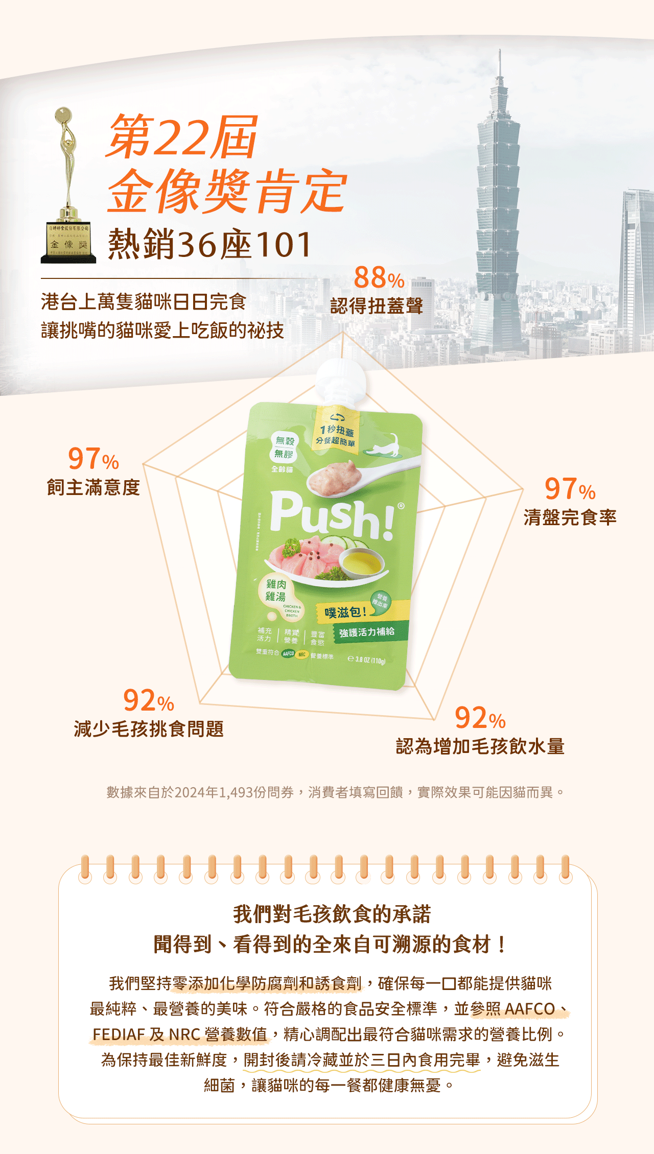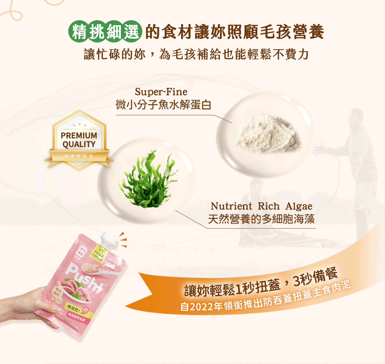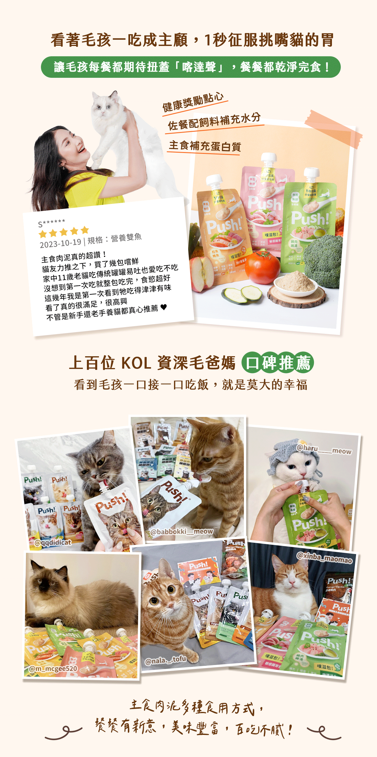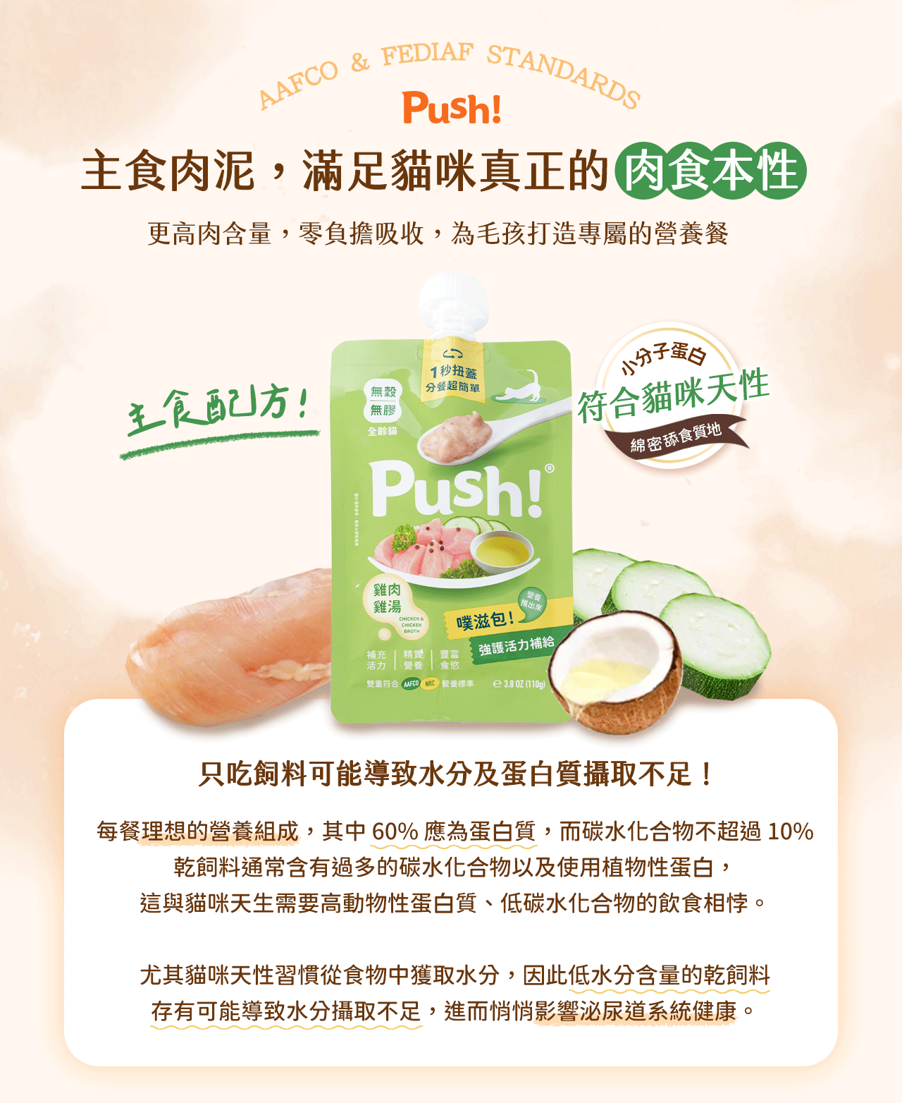 Push! 堅信「簡單就是健康,健康就要簡單」。每日每刻吃好的食物,讓毛孩維持體態及食慾,相互陪伴每一天就是幸福!