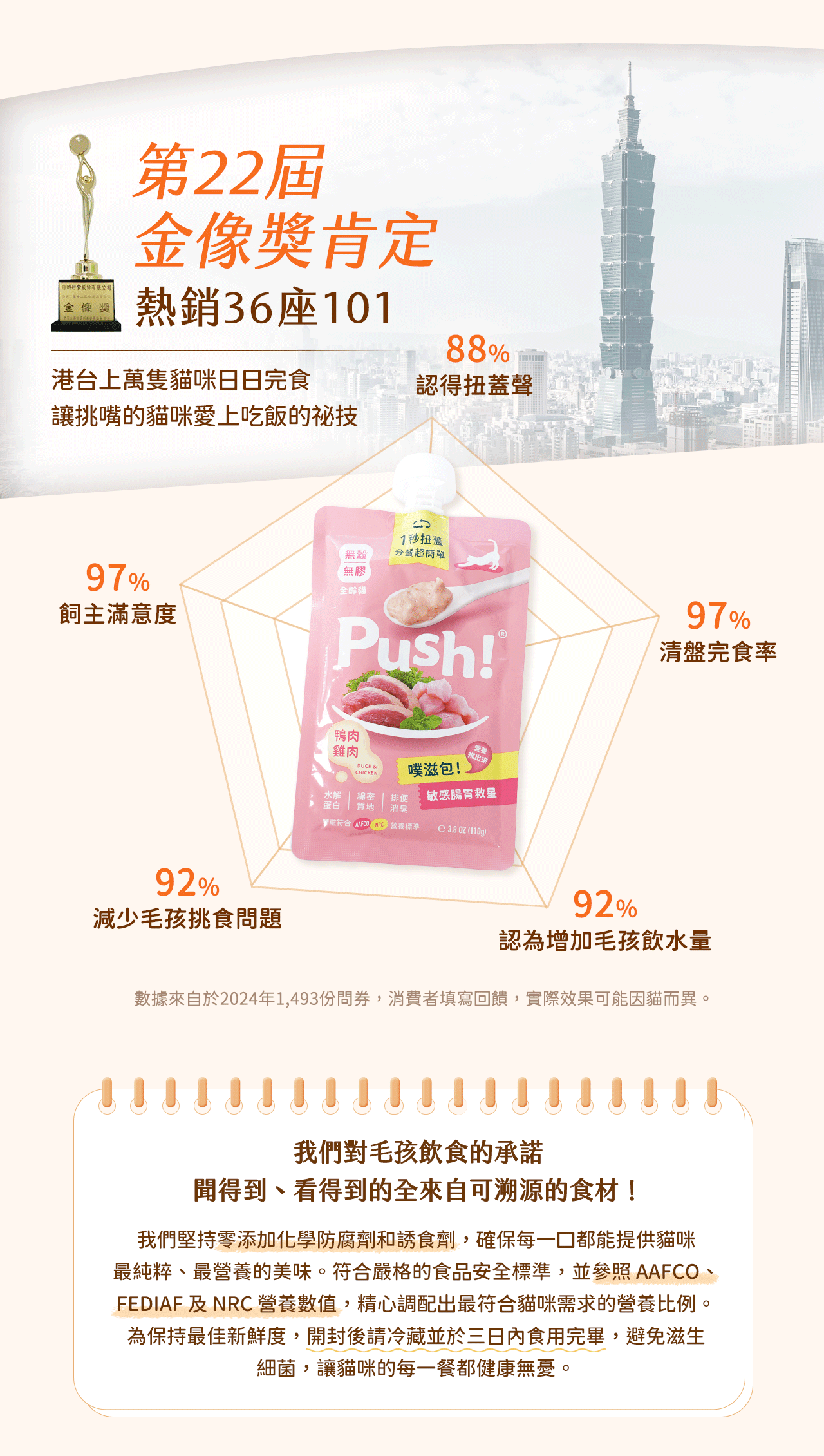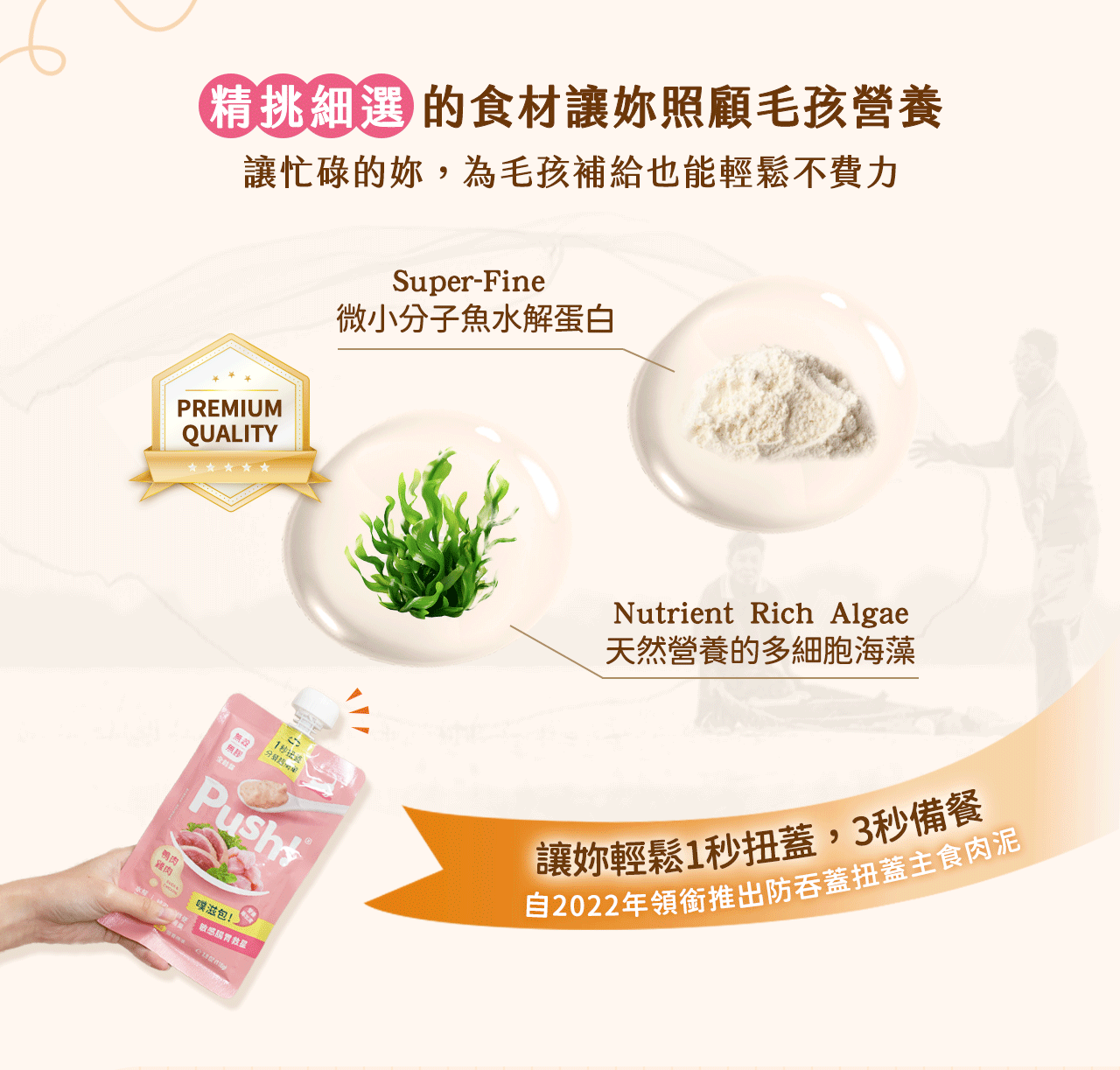 Push! 堅信「簡單就是健康,健康就要簡單」。每日每刻吃好的食物,讓毛孩維持體態及食慾,相互陪伴每一天就是幸福!