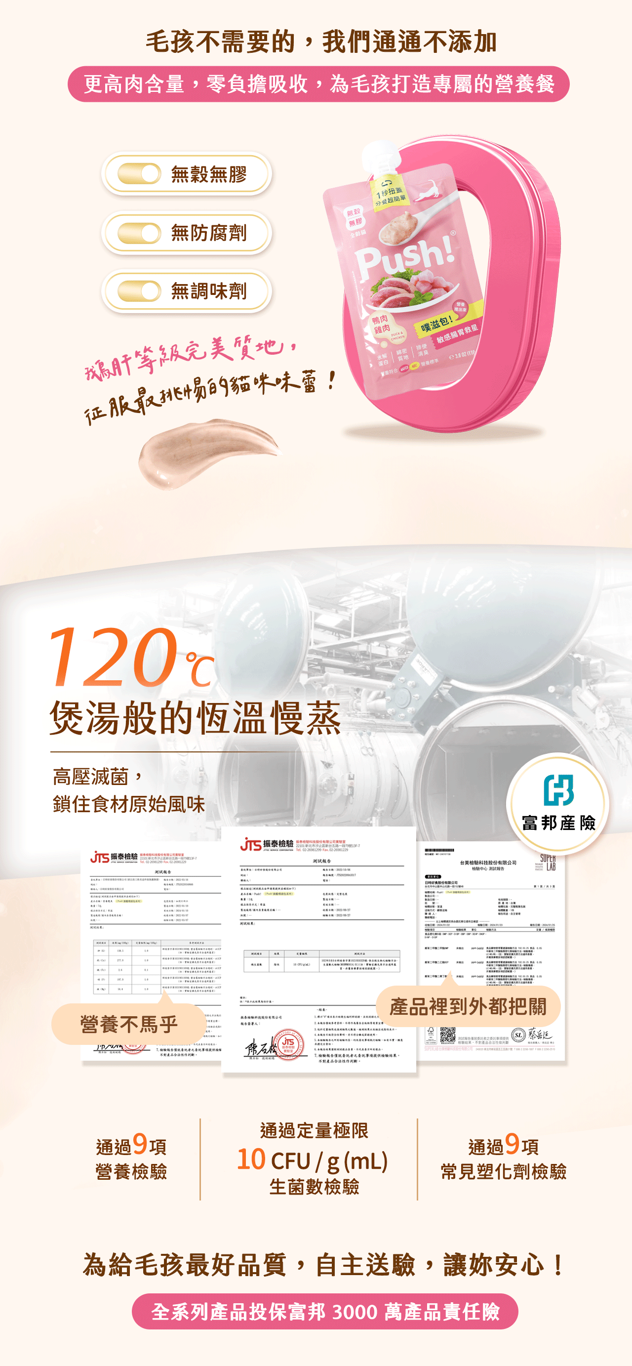 由於 Push! 主食肉泥的食材選用來自不同季節或批次,可能導致成品在色澤和含水量上有些微差異。Push! 堅持不添加色素修飾校正,確保食品安全,同時全系列產品已投保富邦 3000 萬產品責任險,讓毛爸媽更安心。