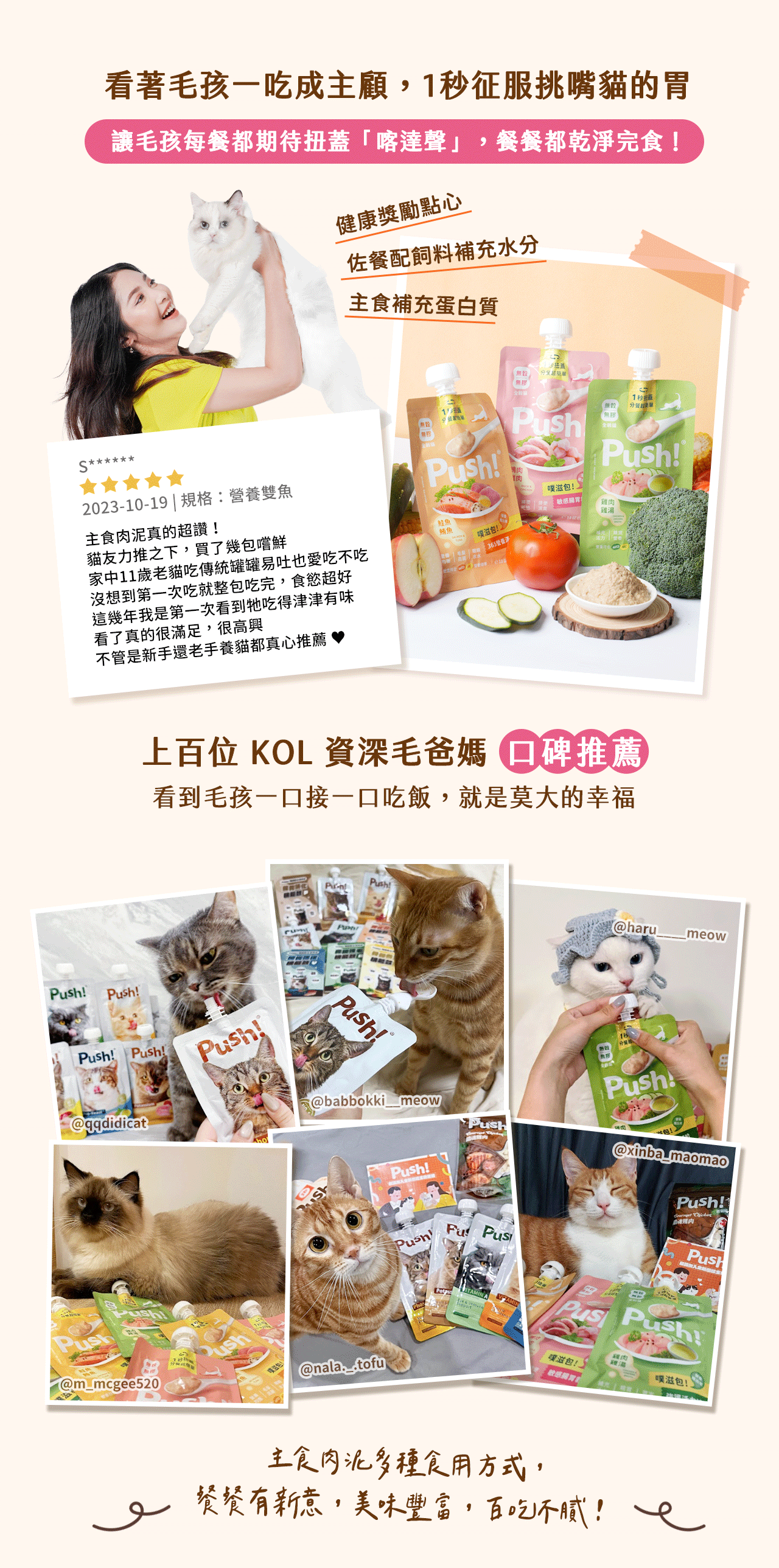 開始進食固態食物的離乳幼貓即可餵食 Push! 主食肉泥,其綿密適口的質地特別適合挑嘴或進食能力較弱的幼貓。此外,牙口不佳的高齡貓(銀髮貓)也能輕鬆食用。對於腎臟疾病的貓咪,由於需注意蛋白質與鈣磷比例,建議根據獸醫師提供的專業意見進一步調整餵食方案。
