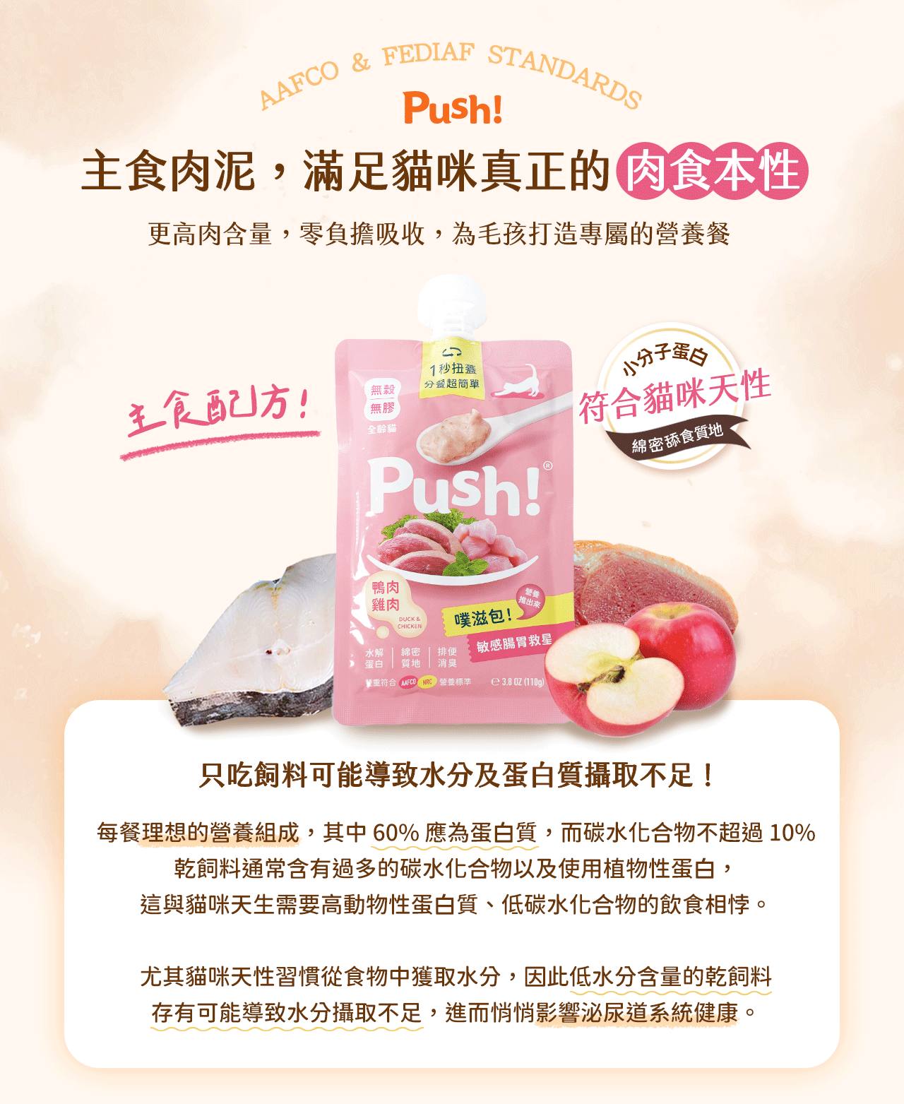 當然可以!全系列 Push! 主食肉泥根據國際寵物食品安全與營養規範打造黃金比例營養,不僅能提供優質的蛋白質來源,還能幫助補充貓咪每日所需的飲水量。